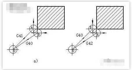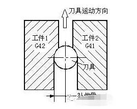 G41指令為刀具半徑左補(bǔ)償(左刀補(bǔ)),G42指令為刀具半徑右補(bǔ)償(右刀補(bǔ)),G40指令為取消刀具半徑補(bǔ)償。這是一組模態(tài)指令,缺省為G40。