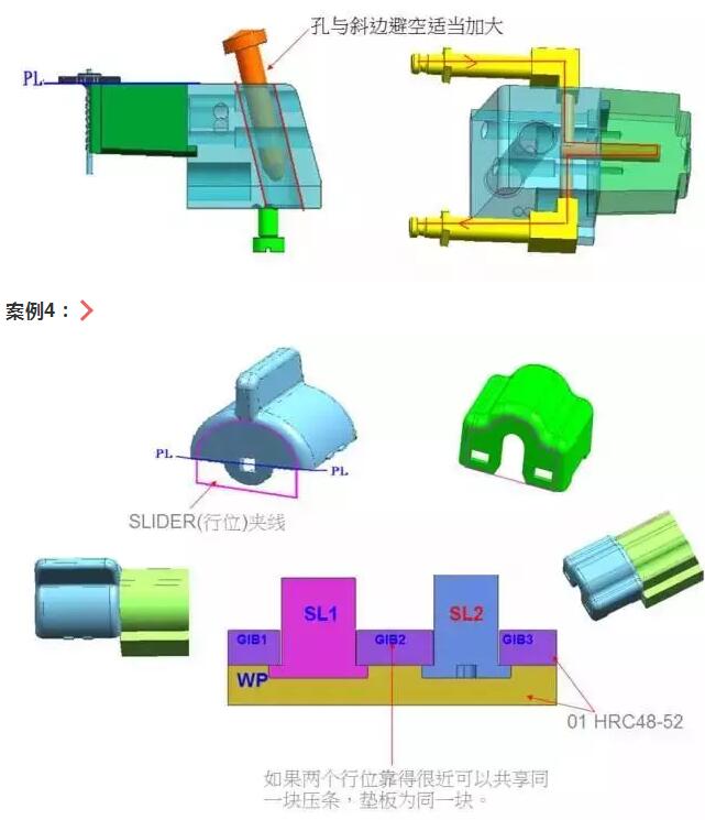 滑塊在開模過程中要運動一定距離,前后模完全分開后,要使滑塊能夠安全回位。滑塊要停在正確的位置,如果滑塊再往前或向后滑行,會導致合模時斜邊與孔對不準發生相撞!所以必須給滑塊安裝定位裝置,且定位裝置必須靈活可靠,保證滑塊在原位不動。