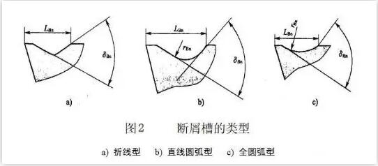 常用的斷屑槽有折線形、直線圓弧形、全圓弧形3種槽型,如圖2所示。