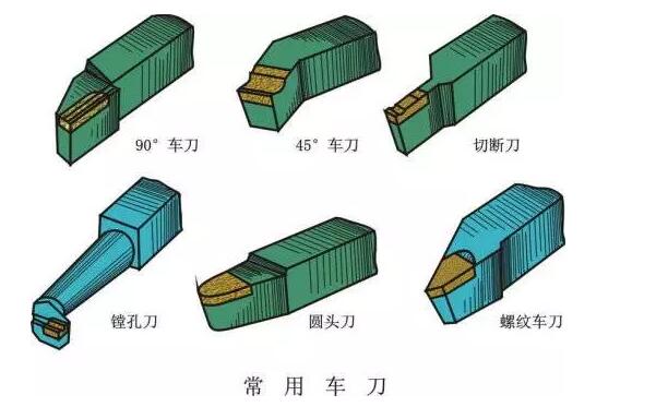 首先,工件被卡盤固定在機床上,接下來,工件在電機的帶動下進行高速轉動,轉速可以按照我們對加工的要求人為控制。然后,就可以開始控制刀具在工件表面進行雕琢,這被稱為“走刀”。常見的車刀往往是用高速鋼或硬質合金制成,近幾年市面上陶瓷刀具和人造金剛石刀具也用的很廣泛。不同形狀的車刀可以滿足各種加工要求: