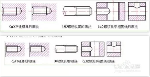 繪制不穿通的螺孔時,一般應(yīng)將鉆孔的深度和螺紋部分的深度分別畫出,如圖3(a)。當(dāng)需要表示螺紋收尾時,螺紋尾部的牙底用與軸線成30o的細(xì)實線表示,如圖3(b)。圖3(c)表示出螺紋孔中相貫線的畫法。