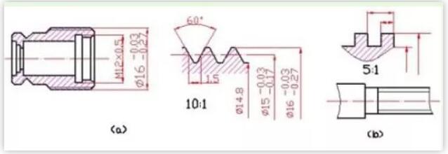 畫非標(biāo)準(zhǔn)牙型的螺紋時,應(yīng)畫出螺紋牙型,并標(biāo)注出所需的尺寸及有關(guān)要求,如圖5。