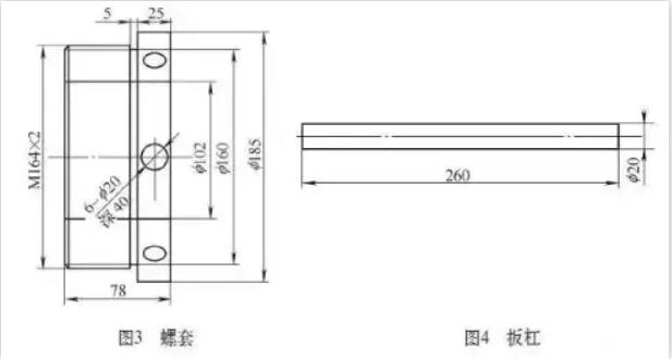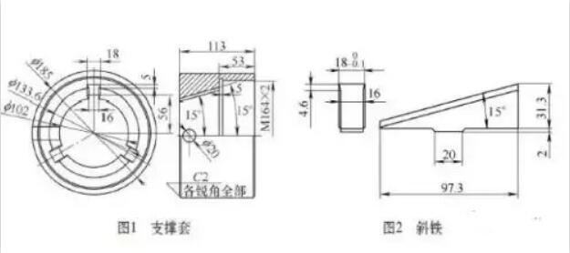 現(xiàn)以卡緊f78~f 98mm細(xì)長(zhǎng)軸的卡套為例進(jìn)行說(shuō)明。該型自動(dòng)定心鎖緊卡套主要由支撐套(見(jiàn)圖1)、斜鐵(見(jiàn)圖2)、螺套(見(jiàn)圖3)和扳杠(見(jiàn)圖4)組成。