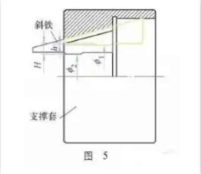 由于支撐套和斜鐵均具有一定的加工誤差,3個(gè)斜鐵的夾持圓周不可能與支撐套的外圓同心,所以必須在3個(gè)斜鐵同時(shí)夾緊同一圓弧的情況下對(duì)支撐套外圓進(jìn)行再車(chē)削。對(duì)支撐套表面進(jìn)行淬火后再進(jìn)行磨削,是為了提高支撐套的使用壽命。由于該卡套主要是用來(lái)夾持毛坯類(lèi)軸件,其外圖 5 圓較不規(guī)則,為防止斜鐵在夾緊工件的過(guò)程中出現(xiàn)翹曲支撐的現(xiàn)象,必須將斜鐵的相同部位加工出一個(gè)臺(tái)階,臺(tái)階的高度以斜鐵在夾緊工件的過(guò)程中其他部位不接觸工件為準(zhǔn)。