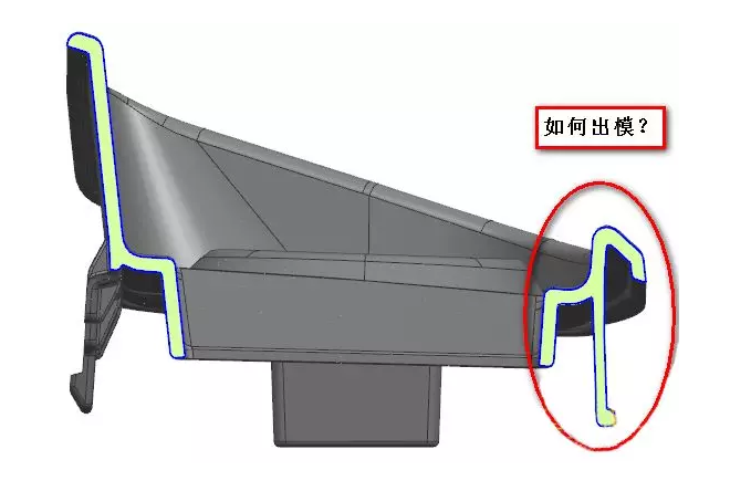 做普通滑塊機構抽出,紅色框的鋼料卡住無法出模,必須線將紅色框的鋼料先脫離產品再抽離倒扣。