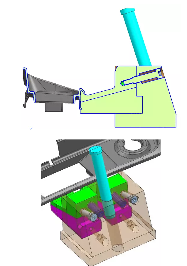 綠色為斜頂,帶突出的燕尾,品紅色為滑塊,主要是抽出倒扣和驅動斜頂向下脫扣,燕尾槽滑配。