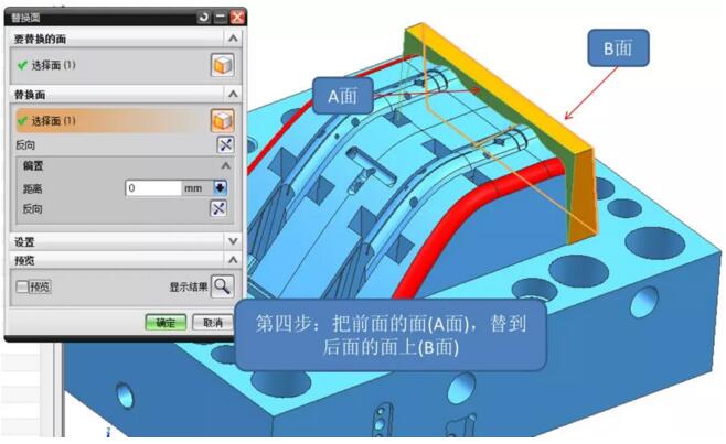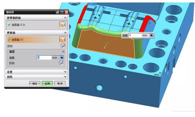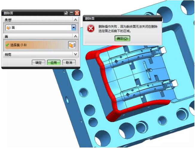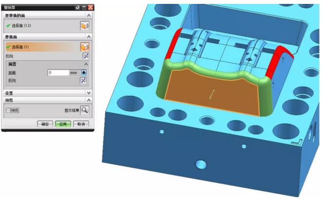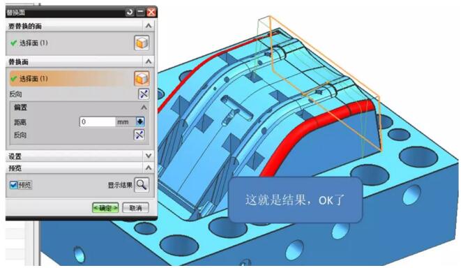 看到?jīng)],那里報警了,啥原因?替換的原理,是把我們選擇的目標(biāo)面,做平我們指定的面,在這個過程中,它周圍相關(guān)的面必須要延伸或縮短,才能形成新的面,在這個過程中,由于公差,或者面的質(zhì)量,或者與旁邊的孔或其它特征有干涉直接難以成型時,就不能生成新的面了。至于到底是什么原因造成這個問題時,工作中,很難有這么多時間去研究清楚。我們一般是直接選其它方法來完成。